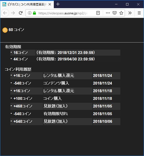 11月18日の540円は購入した100円コインと加入時にデフォルトで追加されるコイン分で購入したビデオレンタルにもかかわらず、計上されてしまっているものと思われる。