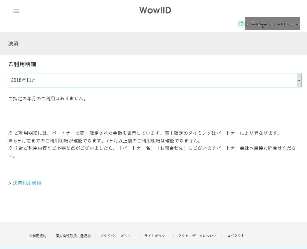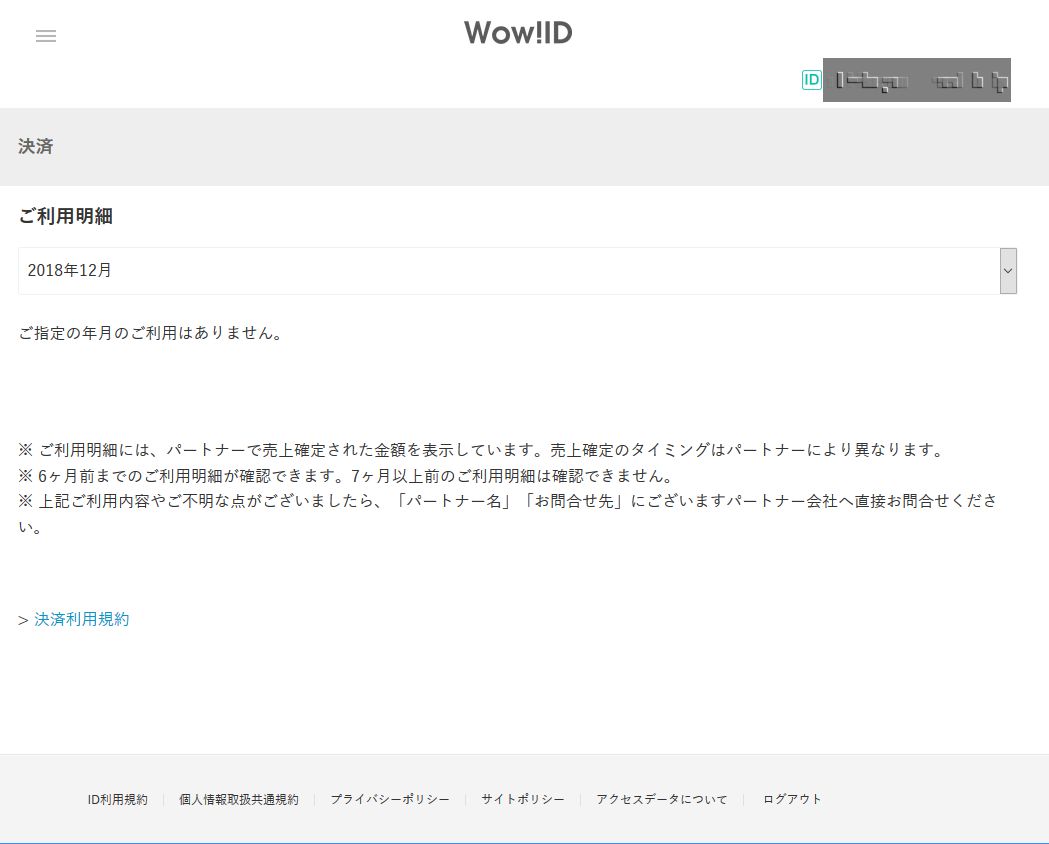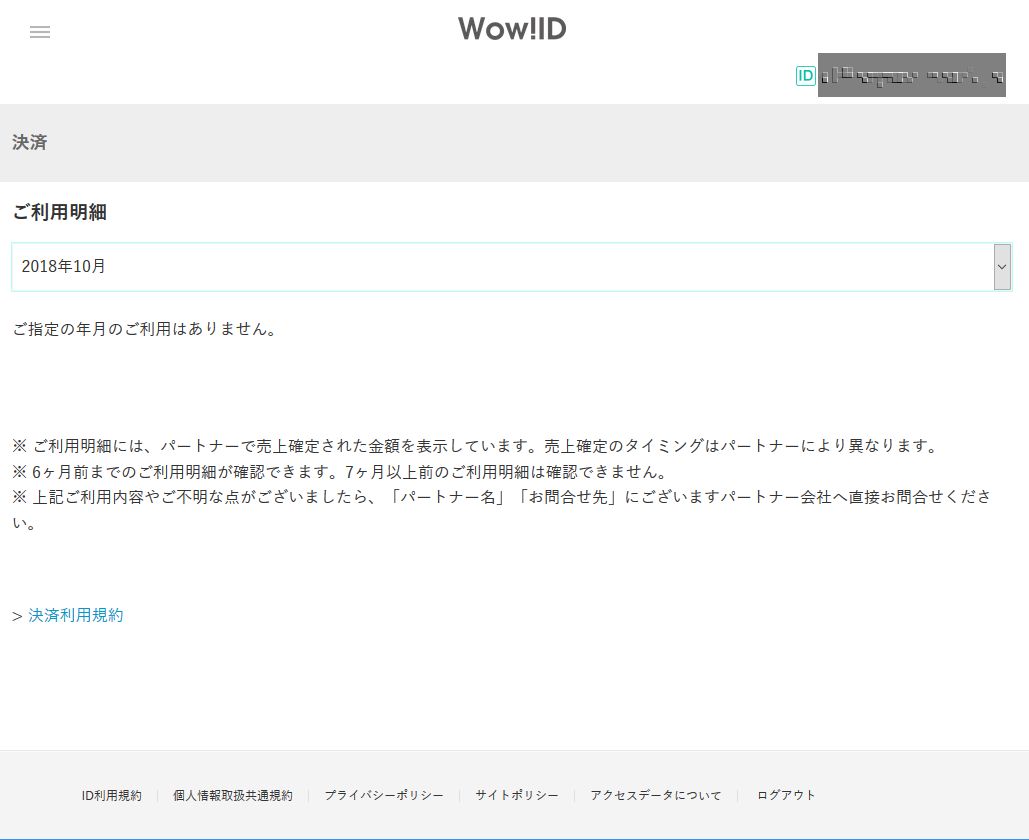 このビデオパスというサービスはau IDかWOW!IDという2つのうちどちらかでサービスアカウントを作成することができる。 WOW!IDで登録したが、このWOW!IDのアカウントの明細をみると全く料金が発生していない状態だった。(下画像参照)