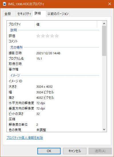 オリジナルファイルのままHEIC形式でダウンロードしたファイルのプロパティは以下