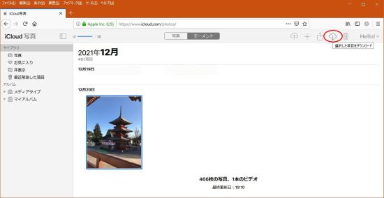 ダウンロードするとき写真を選択し、右上のダウンロードボタン(赤丸)をクリックするが、これだと解像度が劣化してしまう。