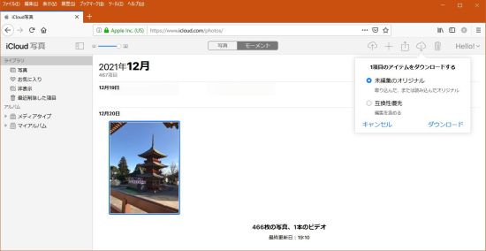 オリジナルのファイルのまま解像度を劣化させない方法は、写真を選択した後、ダウンロードボタンを長押しして、選択メニューを開き、「未編集のオリジナル」を選択する。