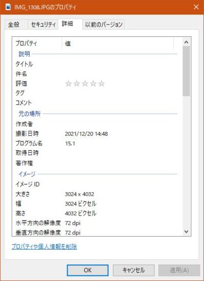 ファイルのプロパーティをみると解像度が「3,024×4,032」から「1,536×2,048」に激落ちている。